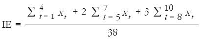 9 Lo primero que se hizo para elaborar el ICSPM fue el Indicador de Eficiencia (IE) para asignarle a cada municipio un puntaje, el cual se ponderó de acuerdo con tres criterios: uno de asignación por evento ocurrido, otro por recurrencia inmediata y otro por el periodo en el que se efectuó. Este puntaje refleja el análisis de una serie temporal de eventos sucesivos, las elecciones municipales, que se realizan en un lapso de tiempo específico, considerado importante para explicar el fenómeno que se estudia. A su vez, se divide en momentos significativos, determinados de acuerdo con criterios de naturaleza particular (política, electoral, temporal, económica, etcétera) y a cada momento se le asigna un valor diferenciado de acuerdo con su importancia cualitativa en la lógica de desenvolvimiento del fenómeno. En cada momento, igualmente, se considera la serie de eventos que suceden en su interior, en este caso las victorias que tiene cada partido, valorando en mayor medida cuando estos eventos se presentan de manera consecutiva, como es el refrendo de una victoria de determinado partido en la elección posterior. La asignación de los puntos, con estas consideraciones, se determinó de la siguiente manera: 1) se tomaron en cuenta diez elecciones divididas por décadas, lo que nos dio tres grandes periodos: a) la última elección de la década de 1970 con las tres de la década de 1980, b) las tres elecciones desarrolladas en la década de 1990 y c) finalmente, las tres desarrolladas en la primera década de este siglo. Ajustando los periodos en los casos en que en alguna década ocurrieran más de tres elecciones; 2) a cada uno de estos periodos se les asignó un puntaje máximo diferenciado, resultado del acumulativo de los distintos eventos: primer periodo ocho puntos; segundo, 12 puntos; y tercero, 18 puntos. Dando un puntaje máximo de 38 puntos; 3) el puntaje asignado a cada periodo se hizo con base en los siguientes criterios: a) a cada evento realizado, es decir a cada triunfo de un partido diferente del PRI, se le asigno un puntaje, y si el evento en la siguiente elección se repetía, es decir si el mismo partido ganaba consecutivamente la elección, se le asignaba el doble del puntaje; b) en el primer periodo cada evento valía 1 punto, y cada evento reiterado 2 puntos; en el periodo dos, cada evento 2 puntos y los reiterados 4; finalmente, en el tercer periodo, cada evento 3 puntos y los eventos consecutivos 6 puntos. De tal manera que en un hipotético caso de que en un municipio un partido diferente al PRI hubiese ganado todas las elecciones desde la realizada en la década de 1970, obtendría 38 puntos, el máximo que se puede obtener. En cambio, en el nada hipotético caso en el que en un municipio nunca se hubiera dado la alternancia, este municipio no obtendría ningún punto; para convertir el puntaje en un indicador comparable para que fuera del 0 al 1 se tuvo que dividir el puntaje obtenido en cada municipio entre el máximo de puntos posibles, la fórmula queda de la siguiente manera: