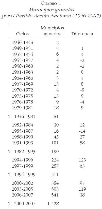 Para darnos una idea de cómo se desarrollo esta dinámica podemos observar el desarrollo electoral del Partido Acción Nacional, la fuerza opositora con mayor permanencia, que surge en 1939. Los cuadros que a continuación se presentan1 muestran los municipios que ganó el Partido Acción Nacional desde 1946 hasta 2007.