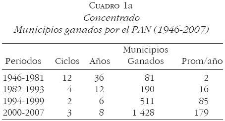 1 Los cuadros son de elaboración propia y fueron realizados con la información obtenida de las siguientes fuentes: Secretaría de Acción Electoral (PAN), "Población gobernada por el PAN, administraciones panistas 1991 (Gobiernos estatales y municipales)", 1991; Juan Reyes del Campillo, Alejandro Carrillo Luvianos y Miguel Ángel Romero Miranda, "Puestos de elección popular ganados por el PAN (19461991)", en "Competitividad, legitimidad y reforma electoral en México", El Cotidiano, núm. 50, septiembreoctubre, México, 1992; [ Links ] Instituto Nacional para el Federalismo y el Desarrollo Municipal, "Radiografía de Filiación Política de los Municipios de México. Cuadro Histórico 19942007", 2007; [ Links ] y María Elena Álvarez Vicencio, "Gobiernos municipales reconocidos al PAN", en Municipio y democracia, Partido Acción Nacional, México, 2000. [ Links ]