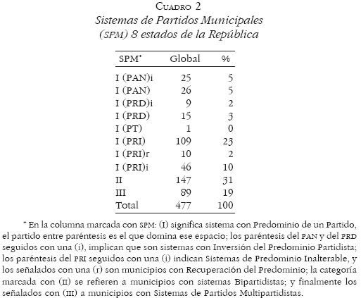 1. La conclusión más general a la que podemos llegar es que en poco menos de la mitad de los municipios (45%) los nuevos sistemas de partido municipales se encuentran definidos claramente, ya que dos terceras partes se encuentran consolidados y una tercera parte en proceso de instauración. Esto significa que en los espacios municipales consolidados o en instauración, el viejo sistema priísta fue suplantado definitiva y permanentemente por otro u otros partidos. En esta situación se encuentran todos los municipios con SPM con predominio de un partido diferente al PRI y la mitad de los municipios con sistemas bipartidistas y multipartidistas.