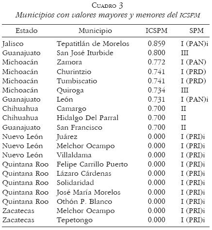 Después del análisis de diez eventos electorales se pueden establecer tendencias claras de la configuración municipal en los ocho estados de la muestra, de acuerdo con el ICSPM. En el Cuadro 3, de los 477 municipios tomados en consideración se enlistan, a manera de ejemplo, los diez municipios que obtuvieron los puntajes más altos, es decir, los que en la actualidad se encuentran en los procesos de conformación de sus SPM más avanzados y los diez municipios con valores menores, aquellos que aún se encuentran viviendo en el sistema predominante en el antiguo régimen.