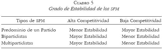 El grado de estabilidad se construye con el Indicador de Competitividad,11 mismo que, traducido dentro de la lógica del cambio de los sistemas de partidos y combinado con las características fundamentales de cada tipo, nos proporciona un umbral12 a partir del cual determinar si un SPM es más o menos estable.