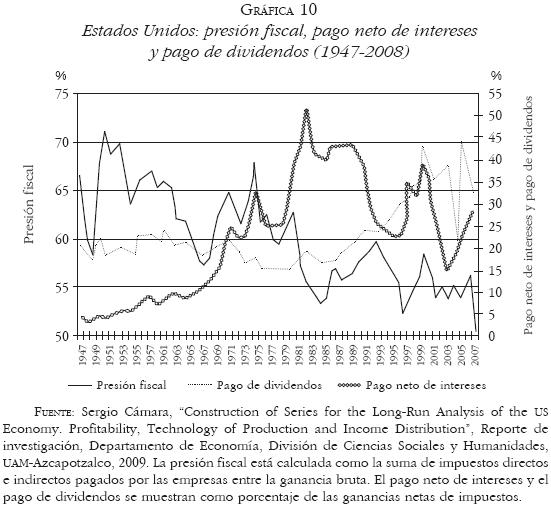 Los Estados desempeñaron un papel fundamental en la restauración del poder del capital como propiedad mediante la articulación de las políticas económicas. Por un lado, la política fiscal neoliberal ha reducido la presión fiscal sobre las empresas (Gráfica 10) y sobre los ingresos más altos, que ha implicado, entre otros aspectos, una recuperación de la tasa de ganancia, después de impuestos, mayor que la recuperación de la tasa general de ganancia.26 Por otro lado, la política monetaria neoliberal quedó determinada por el incremento en las tasas de interés nominales y reales para frenar la escalada de precios en 1979, cuyo objetivo era proteger los intereses del capital como propiedad en detrimento de las condiciones de financiamiento de la inversión productiva de las empresas (Gráfica 4). Esto se refleja en un incremento de la carga de los intereses en relación con las ganancias obtenidas para las empresas (Gráfica 10).
