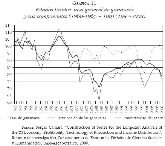 19 El descenso de la tasa general de ganancia en Estados Unidos y su correspondencia con el descenso de la productividad del capital se observa en la Gráfica 11. Sergio Cámara, caracteriza la dinámica global de la economía mundial, representada por Estados Unidos, España y México, e identifica una pauta mundial de descenso tendencial de la tasa de ganancia causada por el cambio técnico sesgado hacia el capital que desemboca en la crisis de la década de 1970. "La dinámica global capitalista. Un análisis de largo plazo en México, España y Estados Unidos", Trayectorias, vol. X, núm. 27, Monterrey, juliodiciembre, 2008, pp. 5562. En numerosos análisis empíricos de la tasa general de ganancia en diversos países, se ha mostrado la misma dinámica de la rentabilidad; al respecto, véanse los trabajos (para el Reino Unido) de Alan Freeman, "National Accounts in Value Terms: The Social Wage and The Profit Rate in Britain, 19501986", en Paul Dunne (ed.), Quantitative Marxism, Cambridge, Reino Unido, Polity Press, 1991, pp. 84106; [ Links ] para Japón, Reino Unido, Alemania y Francia, véase a Minqi Li, Feng Xiao y Andong Zhu, "Long Waves, Institutional Changes, and Historical Trends: A Study of the LongTerm Movement of the Profit Rate in the Capitalist WorldEconomy", Journal of WorldSystems Research, vol. XIII, núm. 1, 2007, pp. 3354; [ Links ] para Grecia, véase a Thanasis Maniatis, "Marxian Macroeconomic Categories in the Greek Economy", Review of Radical Political Economics, vol. 37, núm. 4, 2005, pp. 494516; [ Links ] y para Brasil, Adalmir Marquetti, Eduardo Maldonado Filho y Vladimir Lautert, "The Profit Rate in Brazil, 19532003", mimeo, septiembre 2008; [ Links ] entre otros.