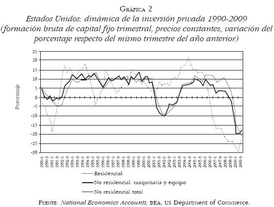 De esta manera, la expansión de la burbuja hipotecaria, por sus efectos positivos sobre el consumo y sobre la inversión en construcción residencial (Gráfica 2), fue el principal elemento dinamizador de la corta y poco vigorosa recuperación que finalizó con la actual crisis.17 La naturaleza de la crisis de 20002001, asociada al fin de la burbuja especulativa de las empresas tecnológicas, lo mismo que las características cualitativas y cuantitativas de la subsecuente recuperación, pusieron en evidencia los límites de la modalidad neoliberal de reestructuración que dio sustento a la expansión de la década de 1990 y, por ello, determinaron la profundidad y extensión de la crisis actual.