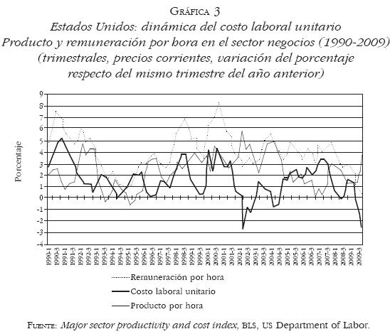 La crisis por la que atraviesa la economía mundial tuvo como detonantes inmediatos combinados, en primer lugar, la desaceleración de la dinámica de la actividad económica en Estados Unidos desde el tercer trimestre de 2006, y el consiguiente aumento de la tasa de desempleo a partir del primer trimestre de 2007 (Gráfica 1), que desembocaron en la recesión cíclica que se desplegó plenamente al finalizar 2007;1 adicionalmente, el fin de la burbuja hipotecaria que comenzó a desinflarse en 2006 y que estalló estrepitosamente en 2007.2 La desaceleración de la dinámica de la inversión productiva (Gráfica 2) y del Producto Interno Bruto (PIB) es atribuible al debilitamiento del flujo de beneficios de las empresas desde el segundo semestre de 2004 y durante 20052006 resultante del repunte de los costos laborales unitarios, por el debilitamiento de la dinámica de la productividad en relación con la de la remuneración (Gráfica 3), y de los costos en energía, por el aumento de los precios del petróleo;3 asimismo, al aumento de las tasas de interés, por el abandono por la Reserva Federal de la política monetaria acomodaticia que había adoptado desde 2001 (Gráfica 4).4 Las tendencias recesivas de la actividad económica fueron reforzadas por el efecto negativo sobre la demanda de consumo de los hogares del progresivo agotamiento de la burbuja hipotecaria a partir de 2006, inducida por el propio debilitamiento de la actividad económica y el empleo y por el aumento de las tasas de interés hipotecarias en ese año.