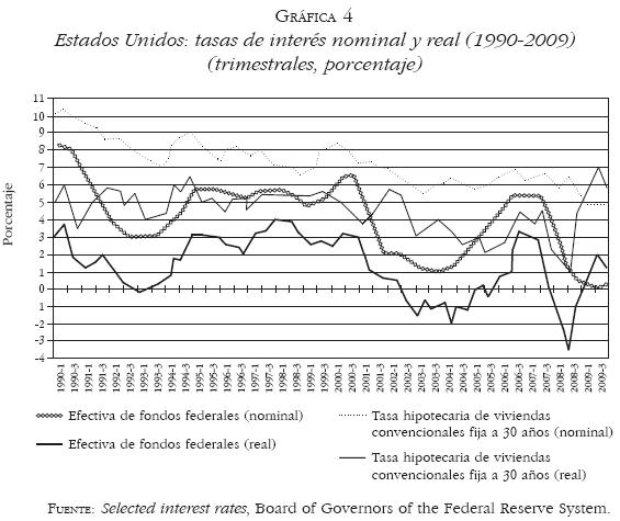 La estrategia anticíclica de la entrante administración de Bush hijo se centró en una drástica disminución de las tasas de interés (Gráfica 4) entre 2001 y 2003 y en una expansiva política fiscal que provocó un acelerado incremento del déficit público. Estas medidas coadyuvaron a que la recesión fuera corta y poco profunda. Sin embargo, la reactivación de la actividad económica a partir del primer trimestre de 2002 no se sustentó en la recuperación de la inversión productiva, sino de la inversión residencial impulsada por la burbuja hipotecaria cuya dilatación, que se venía desarrollando desde 19971998, se reforzó con la reducción de las tasas de interés hipotecarias desde el segundo semestre de 2003 hasta 2005.