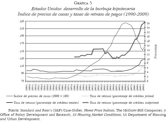 El desarrollo de la burbuja hipotecaria se basó en la desregulación general de los mercados financieros iniciada en la década de 1980,13 que tuvo como uno de sus efectos la creciente titularización de las hipotecas.14 La venta de las hipotecas de sus emisores a los bancos de inversión generó liquidez para seguir expandiendo la oferta crediticia, mientras que el traslado de los riesgos de incumplimiento a los bancos de inversión y a los inversionistas que adquirieron los instrumentos de titularización, generados por estos últimos, propició el desarrollo de prácticas crediticias "innovadoras" que, orientadas a expandir el volumen de los créditos y de las cuotas y comisiones de apertura, redujeron los requisitos de solvencia de los deudores.15 Estas prácticas impulsaron una explosiva expansión del mercado de hipotecas especialmente subprime, de la demanda y construcción de viviendas y del precio de las mismas a partir de 1997, que fue reforzada durante 20012004 por las bajas tasas de interés y por la conjunción de la relativa recuperación del poder de compra de las remuneraciones, a partir del segundo semestre de 2001, y el aumento en el empleo desde el final de 2003. La escalada del precio de las viviendas, al posibilitar el refinanciamiento revolvente de las hipotecas antes del ajuste de las tasas de interés iniciales, retroalimentó el auge especulativo hipotecario que culminó en 20052006. Asimismo, reforzó la expansión del crédito al consumo, no sólo por el efecto riqueza asociado al aumento del valor de los activos hipotecarios, sino por el acceso a crédito respaldado por los propios activos hipotecarios.16