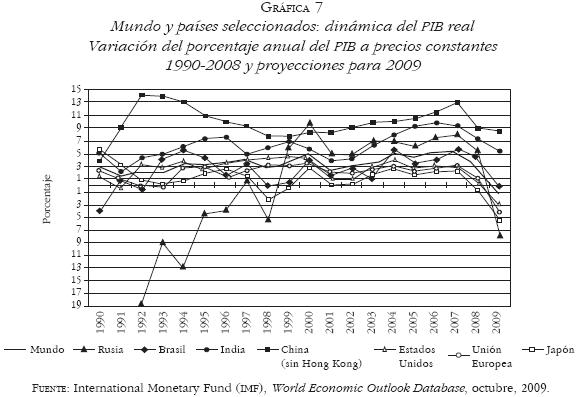 10 El PIB conjunto de estos países, junto con Rusia (los llamados BRIC), representó en 2008 22.7% del PIB mundial. En un trabajo de Abelardo Mariña se señalaba que la profundidad y duración de la crisis actual dependería en fuerte medida de la capacidad de acumulación y crecimiento endógeno de estos países. "Límites y perspectivas de la globalización neoliberal. Una visión general", Trayectorias, vol. X, núm. 27, Monterrey, juliodiciembre, 2008, p. 16. [ Links ]