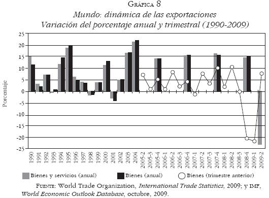 El despliegue durante 2008 de la crisis bancaria y financiera global afectó directamente la dinámica real de todas las economías, en primer lugar, por la escasez general de crédito y por el desplome de los mercados de valores en todo el mundo. Asimismo, la contracción de la actividad económica en los países centrales, al disminuir su demanda de importaciones, detonó una fuerte contracción del comercio internacional durante el cuarto trimestre de 2008 y el primero de 2009 (Gráfica 8), que ha afectado especialmente a los países exportadores, particularmente los de petróleo. Por tanto, la crisis de los países centrales se extendió por las vías bancaria, financiera y comercial al conjunto de la economía mundial, aunque con efectos muy heterogéneos. Entre los nuevos polos dinámicos de las semiperiferias, Rusia ha sido la economía más afectada: la dinámica del PIB se desaceleró a 5.6% anual en 2008 y se estima una fuerte contracción de 7.5% en 2009. Brasil desaceleró su crecimiento a 5.1% en 2008 y tendrá una contracción leve de 0.7% en 2009. En contraste, India y China, aunque a menores ritmos, mantuvieron altas tasas de crecimiento en 2008 y lo mismo se espera para 2009: 7.3% y 5.4%; 9% y 8.5%, respectivamente. El resultado neto de estas dinámicas tan diferenciadas fue una desaceleración de la dinámica del PIB mundial en 2008 (3% anual) y una contracción absoluta en 2009 (estimada en 1.1%) (Gráfica 7). Así, la crisis bancaria y financiera global determinó que la recesión iniciada en los países centrales se generalizara, adquiriendo un carácter mundial. Por su extensión funcional, sectorial y espacial, la crisis actual es una crisis general capitalista. Involucra a todos los espacios económicos y mecanismos de valorización y operación de las distintas formas concretas de capital; de manera particular, a las corporaciones trasnacionales financieras, que combinan actividades productivas, comerciales, de crédito y especulativas.