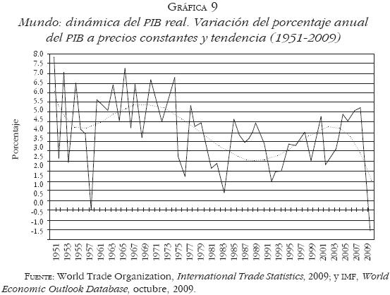 En los primeros años de la década de 1970 se inició una onda larga de lento crecimiento de la economía mundial capitalista, como queda evidenciado en la reducción de las tasa de crecimiento promedio anual del PIB mundial del 5% durante 19511973 al 3% en 19742008 (Gráfica 9). La nueva dinámica estructural de crecimiento de la economía mundial es resultado de la crisis de rentabilidad de la década de 1970 como consecuencia de la manifestación de la tendencia descendente de la tasa general de ganancia al final de la década de 1960 y durante la década de 1970. Se trató de una crisis de sobreacumulación en el sentido clásico, puesto que la tasa general de ganancia descendió como consecuencia del cambio técnico sesgado hacia el capital, lo que se comprueba por el descenso de la productividad del capital18 en la economía mundial.19 Además, fue una crisis estructural porque resultó de la erosión de las bases técnicas, sociales, de regulación estatal e institucionales de valorización del capital.20 Por ende, la crisis conllevó una fuerte presión a la desvalorización del capital, como consecuencia de la sobreacumulación de capital, y una necesidad de transformar las bases estructurales de valorización, como consecuencia de su carácter estructural.