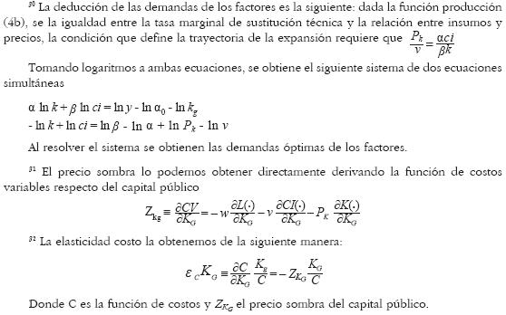 Dada esta especificación, tenemos que las empresas pueden obtener rendimientos constantes en los insumos privados si y sólo si α + β = 1, pero de (4b) se deduce que hay "efectos a escala" cuando las empresas emplean, al menos, algún tipo de infraestructura pública, puesto que 1 + η + σ > 1 .29 Esto es así debido a que la infraestructura pública presume efectos positivos sobre el producto total, lo cual implica que ésta provee economías a escala en la producción.