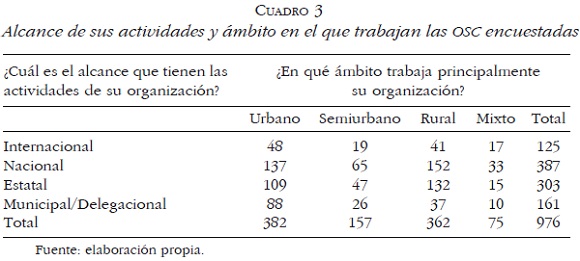 • Alcance de sus actividades y ámbito en el que trabajan. El alcance de las actividades de las OSC encuestadas es generalmente nacional (387 organizaciones) o estatal (303), sólo algunas se circunscriben al nivel municipal/delegacional (161). Lo anterior proporciona evidencia de que sólo 16% de las OSC encuestadas refiere trabajar exclusivamente en el nivel municipal, una cifra mucho menor a la esperada según la revisión de la literatura. Sin embargo, como la pregunta de la encuesta era excluyente, es decir, sólo había forma de contestar una opción de alcance territorial, no podemos saber si estas OSC también tienen actividades en el ámbito estatal, nacional o internacional. Por ello, más adelante se específica con mayor claridad la intensidad con la que las OSC colaboran con municipios. Por otra parte, la mayoría de las OSC encuestadas trabaja ya sea en el ámbito urbano (382) o rural (362), muy pocas atienden a la población de los contextos semiurbanos (157) (Cuadro 3).