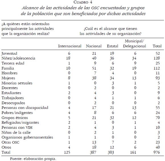 • Destinatarios de las acciones. Otra manera de analizar el perfil de las organizaciones encuestadas es a partir de los destinatarios de sus acciones. La mayoría de ellas dirige sus acciones a la niñez, la familia y las mujeres. No importa que el alcance de las actividades de estas OSC sea municipal, estatal o nacional, pues en todos los casos se presenta la misma situación, es decir, se concentran preferentemente en niños, mujeres y familia en general. Pero también es posible verificar que hay otros grupos vulnerables que gozan de la preferencia de las organizaciones: las personas con discapacidad y los indígenas (Cuadro 4).