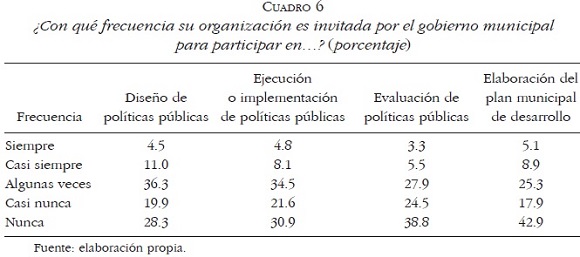 • Frecuencia de la interacción municipios-OSC en el diseño, implementación y evaluación de políticas públicas, así como en la elaboración del Plan Municipal de Desarrollo. Las OSC pueden considerar diferentes formas de colaborar con el municipio. Por ejemplo, pueden trabajar en forma mancomunada, coordinando las acciones y ejecutándolas. Aquí, la participación de las OSC ocurre para ejecutar determinados programas o proyectos, lo cual puede tener la desventaja de subordinarse a programas predefinidos, muchas veces sin participación de la sociedad civil. Sin embargo, las OSC también pueden colaborar con el municipio desde la definición de los planes de trabajo, lo cual les permite un abordaje completamente diferente al esquema anterior, pues tienen mayor margen de maniobra para influir en las prioridades y características de las políticas públicas. Finalmente, otra forma de interacción entre OSC y municipios radica en la capacidad de las primeras para cumplir un rol de monitoreo y evaluación sobre la calidad de los servicios sociales ofrecidos por este ámbito de gobierno. Las diferencias de la colaboración entre OSC y municipios en las etapas del ciclo de políticas públicas son mínimas, pero se puede observar en el Cuadro 6 que las OSC participan más en la ejecución o implementación de políticas públicas y en la elaboración del plan municipal de desarrollo. En contraste, tienen menor incidencia en el diseño y en la evaluación de políticas públicas: la participación de las OSC en todo el ciclo de políticas públicas es limitada.