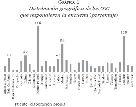 • Distribución geográfica. Al analizar la distribución geográfica de las OSC se observa que las entidades del Distrito Federal, Veracruz y Estado de México concentran 32.8% de las organizaciones que respondieron la encuesta, seguidas por Colima, Baja California y Jalisco que suman 13%. Esta distribución es más o menos congruente con el peso relativo de cada entidad federativa en cuanto al número de OSC registradas en el RFOSC (Gráfica 1).