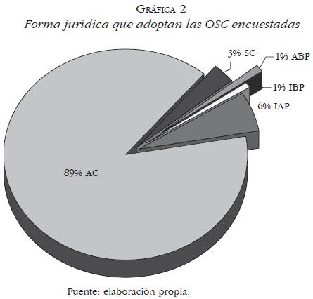 • Forma organizativa. En lo que respecta a su grado de formalización, es posible identificar que más del 97% de las organizaciones encuestadas se encuentran constituidas jurídicamente y la mayor parte de ellas son asociaciones civiles (AC = 89%), siguen en orden de importancia las instituciones de asistencia privada (IAP = 6%) y las sociedades civiles (SC = 3%). Con muy poca participación (cerca de 1% en cada caso) se encuentran las asociaciones de beneficencia privada (ABP) y las instituciones de beneficencia pública (IBP) (Gráfica 2).
