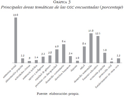 • Área temática. La principal temática que abordan las OSC encuestadas es la asistencia social (23%), seguida por desarrollo sustentable (15%), fomento educativo (13.5%) y desarrollo comunitario (9.4%). Por su parte, las temáticas menos significativas son: asistencia jurídica (1.4%), deporte (1%), actividades cívicas (0.9%) y protección civil (0.6%) (Gráfica 3). Estos contrastes guardan una correspondencia con las dificultades en el acceso y con la calidad de los servicios sociales. En cierto modo podría argumentarse que la aparición del tercer sector en servicios educativos y sociales puede ser interpretada como una respuesta a los déficits de eficiencia o equidad de la provisión pública. Sin embargo, llama la atención la predominancia del tema de desarrollo sustentable, sin duda, esta situación abre una línea de investigación futura.