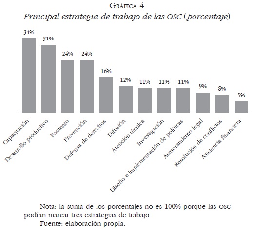 • Estrategia de trabajo. Finalmente, en cuanto al perfil de las organizaciones, otra variable a analizar fue la estrategia que describe mejor el trabajo que hacen las OSC a favor de su población objetivo. Al respecto, 34% de éstas contestó que su principal estrategia de trabajo es la capacitación o educación; otro 31% señaló a las actividades de desarrollo productivo, 24% a las de fomento y 24% a las de prevención. Asimismo, la defensa de derechos es otra estrategia de trabajo importante entre las OSC encuestadas (16%). En el rubro que nos ocupa, el diseño o implementación de políticas públicas, sólo 11% de las OSC contestaron que la utilizan como estrategia de trabajo. Pero las estrategias que menos se utilizan son asesoría legal (9%), resolución de conflictos (8%) y asistencia financiera (5%) (Gráfica 4).