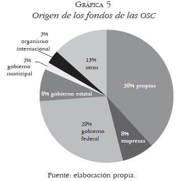 • Origen de los fondos de las organizaciones. El análisis de las siguientes preguntas busca identificar los mecanismos de coordinación de las OSC con los actores públicos. Por ello, una de las primeras preguntas que se abordó dentro de esta sección de la encuesta estuvo relacionada con el origen de los fondos que éstas utilizan. Sobre este punto es importante hacer notar que 38% trabajan con recursos propios, por lo que en este rubro no recurren al apoyo del sector público. Sin embargo, 28% de ellas señalan que el gobierno federal financia sus actividades; para 8% son los gobiernos estatales y para 2% son los gobiernos municipales. Este último dato es muy importante para el objetivo de este estudio, pues indica que es poca la proporción de OSC que reciben ayuda de municipios mexicanos. En lugar de obtener apoyo financiero del sector público, subsisten con recursos propios (13%) o depende de empresas privadas (8%) y organismos internacionales (3%) (Gráfica 5).