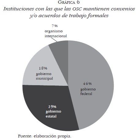 • Instituciones con las que las OSC mantienen convenios y/o acuerdos de trabajo formales. Para muchas OSC comenzar a brindar servicios sociales representa un cambio significativo en su lógica de funcionamiento, pues en algunos casos, la prestación de dichos servicios es precedida por la firma de convenios con sus contrapartes públicas. Esos convenios más la obtención de retribuciones monetarias por los servicios genera mayor estabilidad a las organizaciones, pero al mismo tiempo puede limitar considerablemente su autonomía. Al respecto, 46% de las OSC encuestadas han firmado convenios con el gobierno federal, 29% con gobiernos estatales y sólo 18% con gobiernos municipales. También algunas lo han hecho con organismos internacionales (7%) (Gráfica 6).