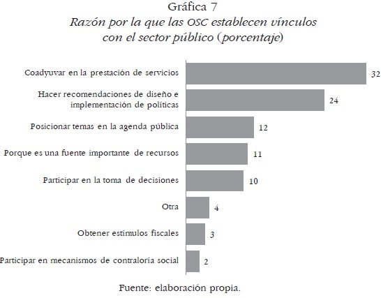 Al analizar globalmente las materias motivo de los contactos entre las partes, se constata que más de la tercera parte de las OSC se refieren a coadyuvar en la prestación de los servicios sociales (32%). Por otra parte, poco más de un quinto de las organizaciones encuestadas (24%) manifiestan que los contactos son para hacer recomendaciones de diseño e implementación de políticas públicas. Otro segmento importante de OSC considera necesario mantener vínculos son el sector público para posicionar sus temas en la agenda (12%). Solamente una pequeña parte lo hace por aspectos económicos (11%) o para participar en la toma de decisiones (10%) (Gráfica 7).