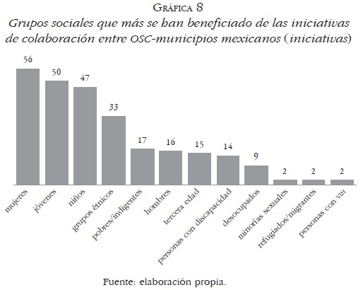 • Estado de las iniciativas de colaboración entre OSC-municipios mexicanos y grupos sociales que más se han beneficiado con ellas. A pesar de todo, existen algunas experiencias de OSC que colaboran con municipios para la prestación de servicios sociales, mismas que surgen de instancias convocadas por el municipio y donde se diseñan, ejecutan y evalúan políticas públicas. Por ello, es importante observar el estado de esas experiencias de colaboración. Sobre el particular, 39% de ellas está en proceso de diseño o planeación; 41% se están implementando y 20% ya se han ejecutado. Respecto de los grupos de población que más se han beneficiado con estas experiencias de colaboración entre OSC y municipios se encuentran las mujeres (56 experiencias), los jóvenes (50), los niños (47), así como los grupos étnicos (33). Otros grupos vulnerables no han podido beneficiarse tanto de la colaboración público-privada en servicios sociales, tales como las minorías sexuales, los migrantes y las personas con VIH, pues todos ellos sólo han sido beneficiados con dos experiencias de colaboración (Gráfica 8).