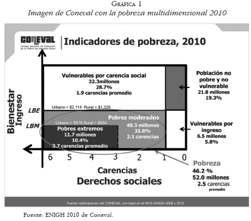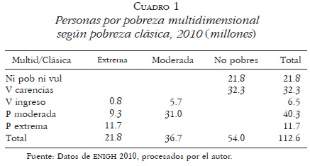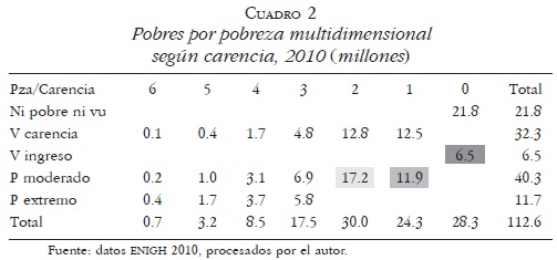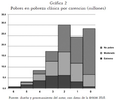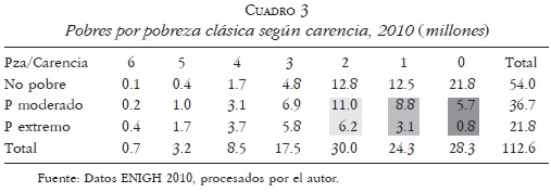 Con base en el Cuadro 1, es posible mostrar los cambios entre la clasificación clásica, de extremo y moderado, hasta 2000 y la pobreza multidimensional, dos pobrezas y dos vulnerabilidades, aplicada en 2010. Recordemos que las seis carencias sociales para definir pobrezas y vulnerabilidades son: rezago educativo, servicio de salud, seguridad social, calidad de la vivienda, servicios en la vivienda y acceso a la alimentación; estos conceptos miden las existencias y carencias sociales. La encuesta define ahora los pobres extremos como aquellos que tienen ingresos por debajo de la acostumbrada línea de la pobreza (extrema o alimentaria) pero que además tengan al menos tres de las seis carencias sociales.
