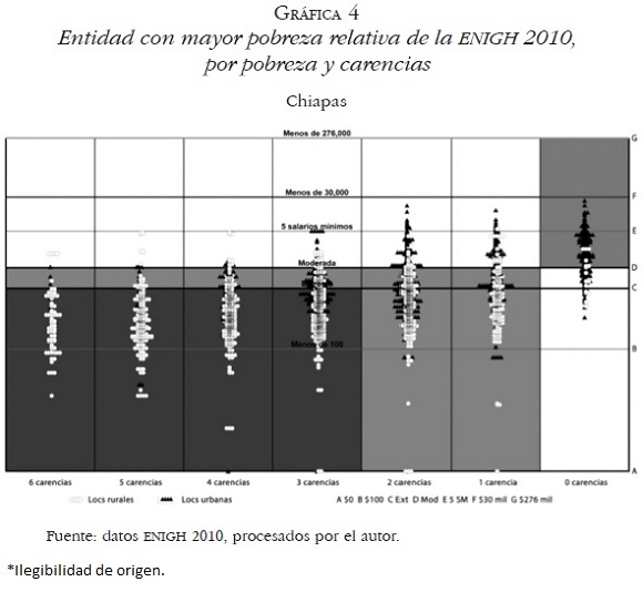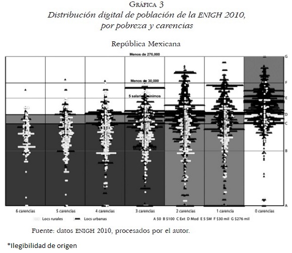 La fusión se convierte entonces en 112 561 puntos presentados en la columna correspondiente a su número de carencias y con altura según ingreso. La alta concentración de puntos en columnas dos a cero refleja el alto monto de personas clasificadas en esas categorías. En la zona más oscura está la pobreza extrema, que de izquierda a derecha son las columnas de seis a tres carencias (11.7 millones de pobres extremos multidimensionales). Son 11 mil puntos, cada uno representa mil personas, con forma de triángulos negros para los urbanos o con forma de círculos blancos para los rurales. La zona de pobreza moderada multidimensional contiene 40 mil puntos de manera muy densa para representar los 40 millones correspondientes. Cada columna, cruzada con el color, expresa los cortes multidimensionales y a la vez son visibles los cortes clásicos de pobreza extrema y moderada. Hay siete líneas que atraviesan de lado a lado las columnas. De inferior a superior son, la línea inicial que representa el ingreso cero (A); la línea de 100 pesos de ingreso (B), es la primera casi a la mitad del espacio extremo; la del corte de pobreza por ingreso de nivel extremo (C); la del corte de pobreza moderada (D); la de cinco salarios mínimos que está en el primer tercio de la zona de vulnerables por carencias (E); la de 30 mil pesos que está en el segundo tercio del mismo espacio de vulnerabilidad (F); y la de 276 mil pesos que es un máximo de ingreso observado (G). Así, 536 mil personas reciben menos de $100 de ingreso, son los 536 puntos debajo de la primera línea. Debajo del corte de cinco salarios mínimos existen 106.8 millones de habitantes, o sea 94.9% de la población.