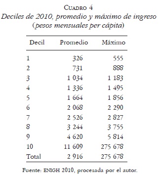 El Cuadro 4 de los deciles 2010 merece análisis; en él están los deciles indicando, por columna, el promedio de ingresos por persona en el decil y el máximo alcanzado en él. En este cuadro es claro que el salario mínimo da información que respalda los estudios donde señalan el crecimiento de las pobrezas.