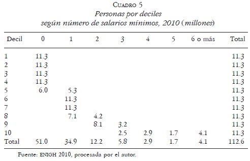 Para precisar las últimas cantidades, el Cuadro 5 clasifica en cada decil a las personas que alcanzan diferentes montos de salarios mínimos. Así, todo el decil uno gana cero salarios mínimos, si 555 fue citado como el máximo ingreso en el decil, obvio no llega a la cantidad de 1 673. Son 11.3 millones de mexicanos en este caso. Segundo, tercero y cuarto deciles tampoco alcanzan la frontera de los 1 673 por lo que más de 33 millones se suman a la categoría de cero salarios mínimos. La categoría se completa con algunas personas del decil cinco, son 6 millones. El total de esta primera categoría es de 51.0 millones de habitantes que tienen menos de un salario mínimo como ingreso y representan 45.3 por ciento.