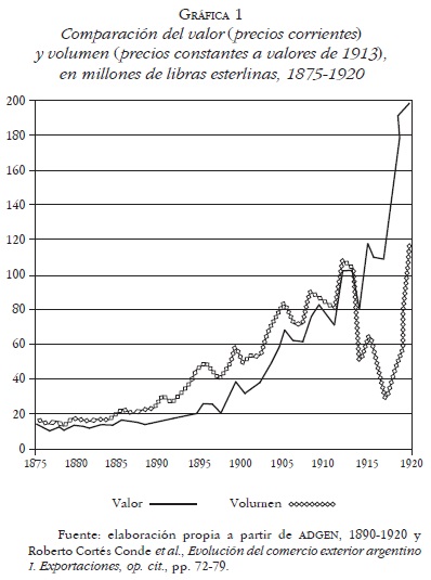 Como resultado de esta comparación es importante destacar que el volumen tendió a decrecer desde 1912, y más aún a partir del año siguiente, hasta 1917 incluso, y luego repuntó. Sin embargo, los valores tendieron a ascender durante toda la contienda. Esta tendencia reviste una gran diferencia con los patrones de comportamiento en el periodo 1875-1912, ya que entonces el volumen tendía a aumentar más que el valor.
