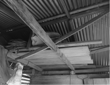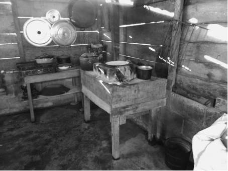 ¡Ah, la cocina!, bueno es que nosotros estamos acostumbrados a estar en una cocina grande; también las mujeres que no están acostumbradas a estar trabajando así al fogón a como está, a como lo hicieron. Lo remodelamos pues, lo quitamos de ahí porque más bien, los tubos son los únicos que quedaron mal, hay partes que topó en el canal donde baja el agua. No tocó aquí en el lomo y por ahí se metía el agua y pues entonces muchos lo quitamos porque ahí se llovía. Cuando venía a ver ya llegaba hasta aquí el agua, yo se lo quité; el fogón también se lo quité, porque por ahí también hice una galerita, y como tenemos la estufa ya la agüita para el café o cualquier desayuno con un huevo, un frijolito con estufa de gas. 35
