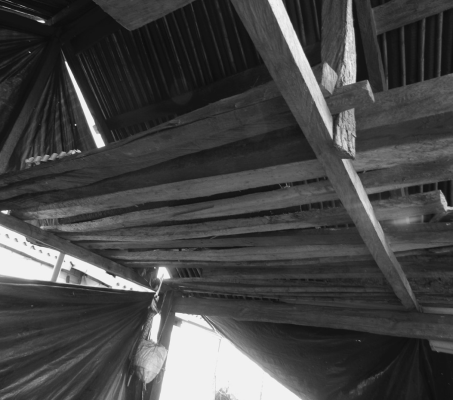 Antes estábamos en el ejido de aquí de Juan del Grijalva, estábamos en el rancho, bueno, allá teníamos una casita mejor; bueno aquí de hecho está más o menos según se ve pero le entra agua, la mera verdad le digo a mi señora: "cuando haya dinero vamos a componer porque si no uno no puede vivir así cuando llueve; donde quiera se trinca la gotera a caer. Ya le eché tapa goteras pero no sé de donde es que le entra; los portillos todo ahí pero sigue entando agua, en la pared también filtra, hay partes que ya lo repellé pero el adoblock no queda bien, no sé. 28