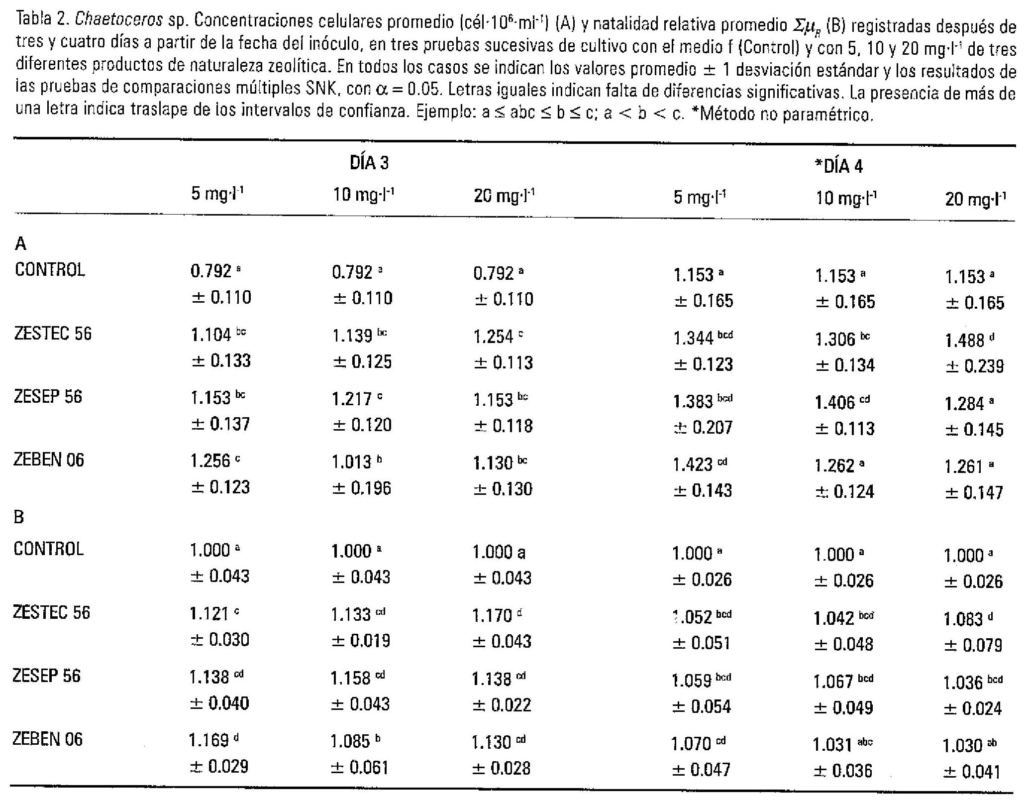 En la Tabla 2A, se puede apreciar que tres días después del inóculo, todos los cultivos de Chaetoceros en los medios con PZN tenían concentraciones celulares significativamente superiores que las registradas en los cultivos control y que las más altas se encontraron con 20 mg-l-1 de Zestec 56, con 10 mg-l-1 de Zesep 56 y con 5 mg-l-1 de Zeben 06, sin diferencias entre estos tres enriquecimientos. En el cuarto día de cultivo estos mismos tratamientos dieron nuevamente los resultados mejores, mientras que en tres casos (20 mg-l-1 de Zesep 56 y 10 y 20 mg-l-1 de Zeben 06) las concentraciones celulares no resultaron significativamente mayores de las encontradas con el medio f sin PNZ.