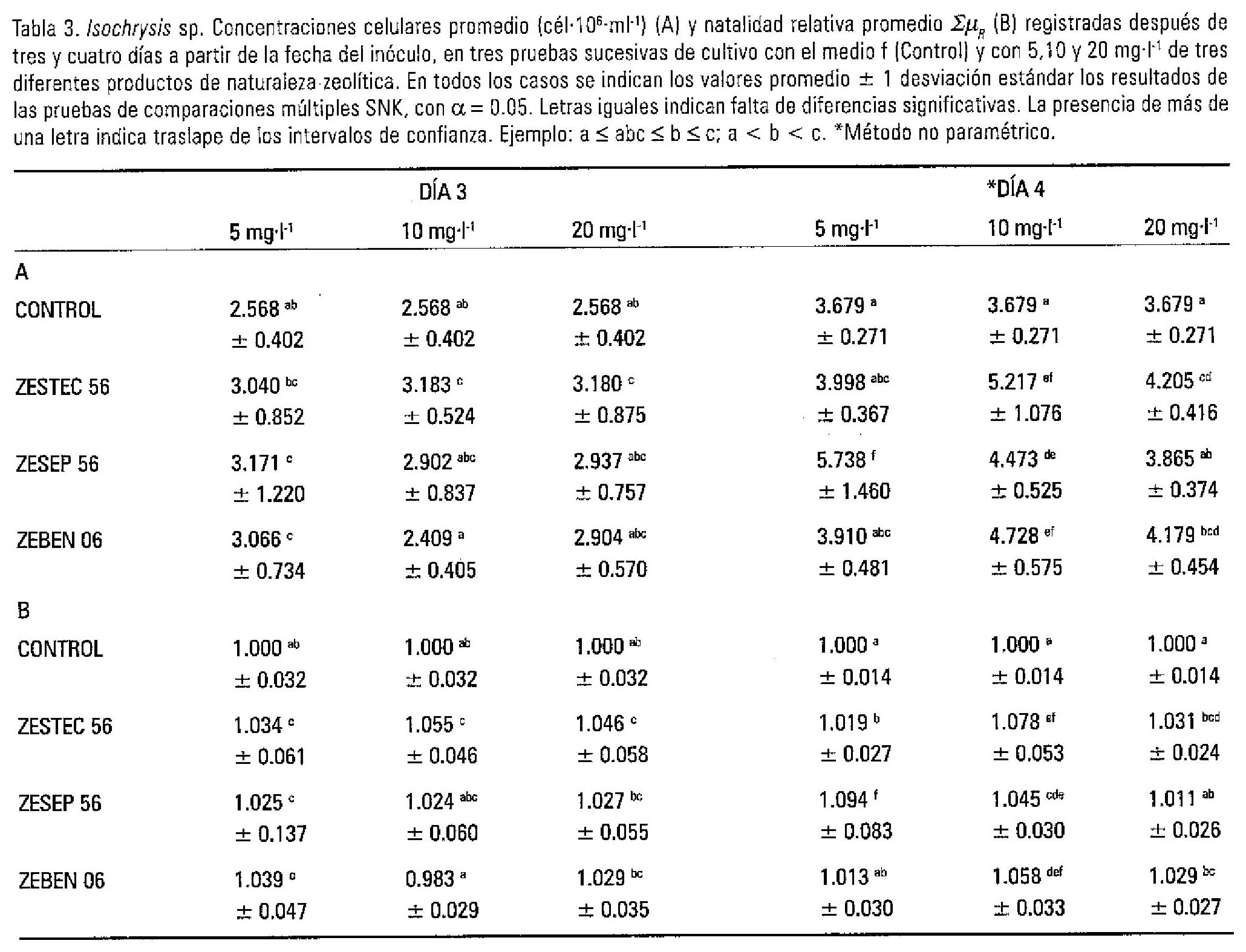 En el caso de Isochrysis sp. de la misma manera que con Chaetoceros sp. se hace evidente el efecto positivo del enriquecimiento con PNZ, con una tendencia generalizada a concentraciones celulares promedio mayores prácticamente en todos los tratamientos con respecto al control, aunque en varios casos las diferencias no resultaron estadísticamente significativas. Esto se explica por los diferentes valores de concentración que se encontraron en las tres pruebas, que se ven reflejados por los altos valores de la desviación estándar que se reportan en la Tabla 3A. De todas maneras, las mejores cosechas se obtuvieron, para el día 3, con 10 y 20 mg-l-1 de Zestec 56 y con 5 mg-l-1 de Zesep 56 y Zeben 06, mientras que el día 4 el mejor resultado fue con Zesep 56, aunque esto no resultó estadísticamente diferente de los valores obtenidos con mg-l-1 de los otros dos PNZ.