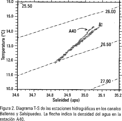 El diagrama T-S de los canales de Ballenas y Salsipuedes (Fig. 2) presentó dos masas de agua bien definidas, con un intervalo en la densidad del agua de 26.2-26.5 de σt. El Agua Subsuperficial Subtropical (ASsSt) que se localizó por debajo de los 350 m con salinidad menor a 34.9 ups (unidades prácticas de salinidad) y 11.5 °C, y el Agua del Golfo de California (AGC) que se caracteriza como una agua relativamente tibia y de alta salinidad (>34.90 ups), son masas de agua previamente descritas por Torres-Orozco (1993), Griffiths (1968) y Stevenson (1970). En este estudio no se encontraron diferencias físico-oceanográficas entre las estaciones de la línea de muestreo (A31 a la A39). Sin embargo, la estación A40 mostró el mismo promedio superficial de temperatura, pero con diferencias menores de 0.025 ups (Tabla 1). Esta diferencia de salinidad en superficie, se debió posiblemente a la influencia del Agua Superficial Ecuatorial (ASE) que se transportó hacia el norte del Canal Salsipuedes por medio de procesos advectivos locales. Por debajo de los 200 m de profundidad, la estación A40 mostró condiciones similares al resto de las estaciones.