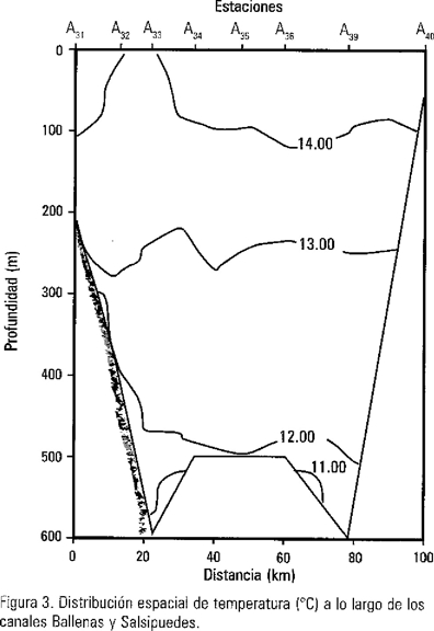 Asimismo, se puede observar para superficie, que el agua con bajas temperaturas proceden del Canal de Ballenas (Fig. 3, estación A32 y A33) y frente a la Isla San Esteban; posiblemente ocasionadas por el efecto de mezcla por marea. De igual manera, la imagen de temperatura superficial por satélite (no se presenta) permite detectar un desplazamiento de agua fría hacia el sur de las grandes islas, lo que provoca un frente con el agua cálida proveniente del sur del Golfo de California.