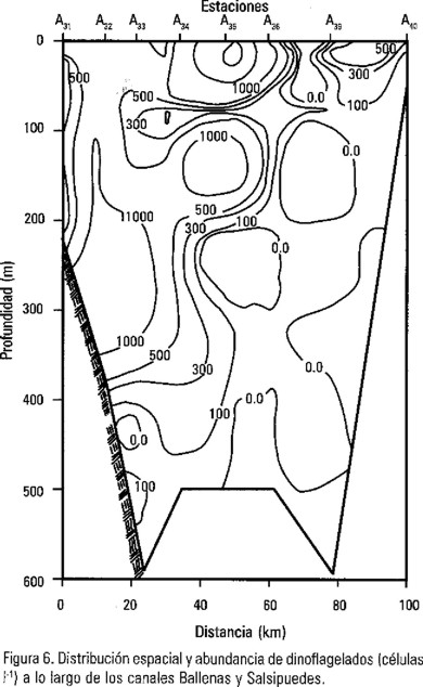 En general, la distribución vertical de las diatomeas y dinoflagelados mostraron una relación inversa con relación a la profundidad (Figs. 5 y 6). Sin embargo, a los 50 m de profundidad en la estación A35 se detectó un incremento en la abundancia de diatomeas de... 18 × 103 células l-1, valores similares a los reportados en otoño por Gárate-Lizarraga et al. (1990) y en verano por López-Vergara (1993); y menores en un orden de magnitud que los reportados para primavera por Álvarez-Borrego y Gaxiola-Castro (1987), y Cortés-Lara, et al. (1999). La abundancia de células de diatomeas reportadas en primavera al sur de las Islas San Esteban y San Lorenzo por Millán-Núñez y Gaxiola-Castro (1989) fueron más altos que los reportados en este estudio.