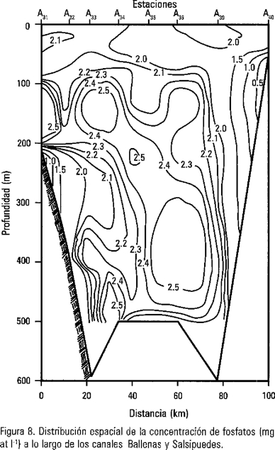 La concentración de fosfatos, silicatos, nitritos y nitratos (Fig. 8, Tabla 1) mostraron una relación inversa en relación al grupo de diatomeas, esta relación posiblemente se debió a que la columna de agua presentó inestabilidad; por lo que, la alta concentración de nutrientes que se detectó en el Canal de Ballenas no pudo ser asimilado por el fitoplancton, debido a la escasa disponibilidad de luz para llevar a cabo la fotosíntesis.