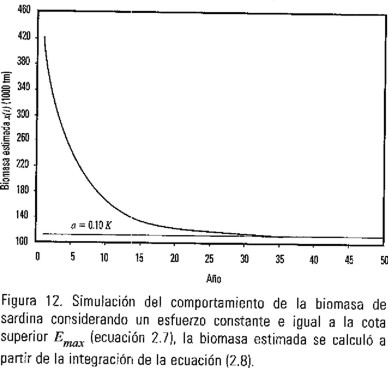 En la Figura 12 aparece el comportamiento de la biomasa predicha para la población de sardina por el modelo de Gompertz-Fox, calculada a partir de la solución de la ecuación (2.8), cuando se considera un valor constante del esfuerzo igual al Emax. Se muestra la permanencia de ésta por arriba del umbral de colapso, aunque tendiendo asintóticamente hacia este último; lo anterior era de esperarse puesto que al cumplirse la condición (2.5a) se garantiza que la biomasa del recurso será mayor o igual al nivel de colapso especificado para el horizonte temporal considerado. Esto podría significar que el esfuerzo pesquero real, desde un punto de vista teórico, no afectó significativamente el nivel de biomasa. Por lo tanto el colapso observado, en las capturas para las temporadas 1991-92, 1992-93 a niveles de aproximadamente 7000 tm, podría haber sido causado por otro tipo de factores y no necesariamente por la acción de la pesquería sobre el recurso; esta hipótesis se apoya en la recuperación sorprendente de la pesquería en los siguientes años, tal como se observa en la Figura 9.