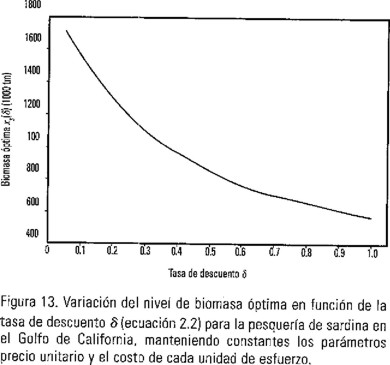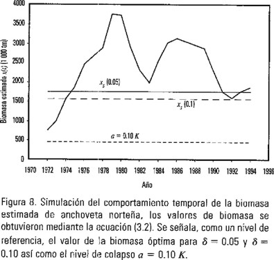 En los mercados financieros internacionales, una cota superior representativa para la variación de la tasa de descuento es de δ = 0.10. La biomasa óptima que se obtiene de la ecuación (2.2) para este valor de δ resulta ser de 1,553,916 tm., lo que representa aproximadamente un 35% del nivel asintótico de biomasa. Si consideramos, de acuerdo con Getz y Haight (1989), que una población se ha colapsado si su biomasa desciende a niveles inferiores al diez por ciento de su capacidad de carga K, esperaríamos que en el caso de la anchoveta norteña aún manteniendo la biomasa en la trayectoria singular xs(0.10) ésta permanecería fuera de la región de colapso.