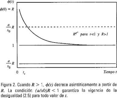 Si mantenemos r negativa, cuando R > 1, ϕ(t) decrecerá a partir de R tendiendo a uno cuando t tiende a infinito. En el caso en el que el producto (a/x0)R toma un valor superior al límite asintótico de ϕ(t) existirá un valor tc a partir del cual la desigualdad (2.4) dejará de cumplirse. Esta situación se ilustra en la Figura 2, utilizando la línea punteada para representar el valor de (a/x0)R. Sin embargo si escogemos R de modo tal que el producto (a/x0)R permanezca por abajo del límite asintótico de ϕ(t) tendremos que la desigualdad (2.4) se cumplirá para todo valor de t. Esta situación se ilustra en la Figura 2 mediante la línea continua para el valor (a/x0)R.