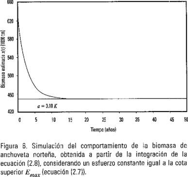 Se hizo una simulación de la variación temporal de la biomasa de sardina mediante la ecuación (3.2), utilizando el valor del parámetro q ajustado mediante la ecuación (3.11) con U(tk) aproximado mediante la media geométrica de valores sucesivos alrededor de tk para la tasa media de captura por unidad de esfuerzo. La Figura 14 muestra la variación respecto al tiempo de la biomasa estimada a partir de los datos de captura por unidad de esfuerzo (ecuación 3.2), también se muestra el nivel de colapso estimado a = 0.10 K.