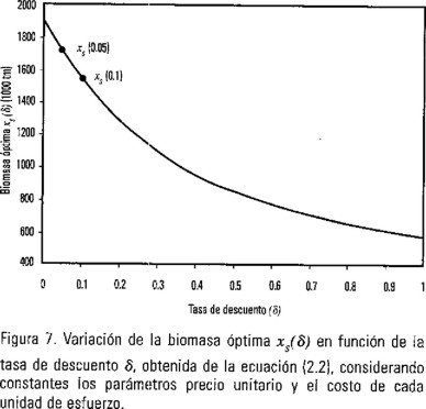Como hemos argumentado, y sin pérdida de generalidad, consideremos que el precio en el mercado de cada unidad de biomasa capturada y el costo de cada unidad de esfuerzo coinciden con sus valores medios y recordemos que denotamos mediante xs(δ) el valor de la biomasa óptima predicha por la ecuación (2.2) para cada valor fijo de la tasa de descuento δ. Tomando la función de costo en la forma C(x) = c/qx (cf. ecuación 6.15I, haciendo μ(xs(t)) = c) siendo c el costo de cada unidad de esfuerzo estandarizado a un nivel internacional y fijado en 2000 dólares/viaje y el precio p de cada tonelada métrica de anchoveta (como harina de pescado) en 300 dólares, calculamos el valor de la biomasa óptima xs(δ) a partir de la ecuación (2.2) para distintos valores de la tasa de descuento. En la Figura 7 podemos observar que el valor de xs(δ) decrece al aumentar δ.