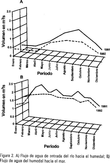 Volumen de agua aportado al humedal por el mar. Las mareas son mixtas semidiurnas con una altura promedio en verano de 0.63 m, mientras en primavera de 0.96 m; los resultados corresponden a un promedio de pleamar, calculado para los dos años (Tabla 2). Los registros indican que en 1992 se presentó un volumen ligeramente mayor en relación a 1993 (Fig. 2B). En 1992 el flujo promedio fue de 1.803 m3/s, con un máximo de 2.31 m3/s registrado en abril, mientras que los flujos más bajos se presentaron en diciembre con 1.31 m3/s. Durante 1993, el promedio fue de 1.74 m3/s; en enero se registró el nivel más bajo con 1.21 m3/s, y el máximo en junio siendo de 2.01 m3/s (Fig. 2B).