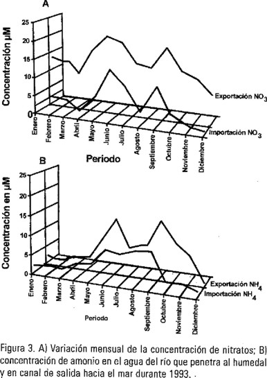 Intercambio de nutrientes por el humedal. En Barra de Tecoanapa se observaron diferencias entre la cantidad de nutrientes aportados por el río y la cantidad a la salida hacia la zona marina. Los resultados indican que los nitratos fueron los que penetraron en mayor cantidad al humedal, con un promedio anual de 7.5 µM; los mínimos se registraron en diciembre y los más altos en junio (1.9 y 16.8 µM), como se observa en la tabla 3 y figura 3A. Las exportaciones de este nutriente duplicaron las entradas, con un patrón semejante a la importación a lo largo del año. El promedio anual de los nitratos en el canal de salida (marino) fue de 14.53 µM, con mínimos en diciembre (7.5 µM) y máximos en mayo (21.0 µM).