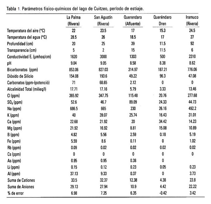 Desde el punto de vista de la fisicoquímica del lago los parámetros que dominan son muy variables (tabla 1) vistos los diferentes ambientes que lo conforman y su asociación con las numerosas fuentes hidrotermales que bordean el lago. Las concentraciones iónicas menores se observan en el drén Queréndaro (Cloro, Sodio, Potasio, bicarbonatos y sulfatos), por efecto de dilución al ingreso de los afluentes. En cambio las conductividades más altas se observaron en la Palma, Iramuco y San Agustín que presentan condiciones de evaporación más es notoria aumentando grandemente los valores de Cloro y Sodio. Respecto al pH, este se mantiene entre 8 y 9, las aguas de los puntos muestreados en el lago son de tipo Sódico-cloruradas-bicarbonatadas. Los sulfatos presentan altas concentraciones en la estación Queréndaro y San Juan Tararameo, estos son aportados por las aguas termales aunque otra componente la conforma la gran cantidad de residuos de origen urbano e industrial descargan hacia al lago principalmente a través del Río Grande de Morelia, así como agroquímicos de las zonas de cultivo de su entorno a través de canales y por filtración.