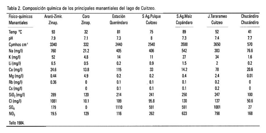 La influencia del hidrotermalismo en el borde sur del lago tiene un reflejo en los anteriores resultados. Los análisis de los manantiales de la rivera del lago que han sido realizados por la C.F.E. (Tello 1984), tabla 2, muestran que las temperaturas de estos reservorios varían entre 29°C (San Bartolomé Coro) hasta 93°C (Zimirao) presentándose, desde el punto de vista geoquímico, tres tipos de aguas sódicas-bicarbonatadas, sódicas-sulfatadas y sódicas-cloruradas-bicarbonatadas.