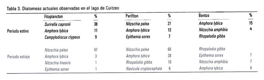 En la tabla 3 se observa que en el lago dominan las especies pennales sobre las centrales siendo Amphora lybica la especie presente en todas las épocas y en todos los sitios.